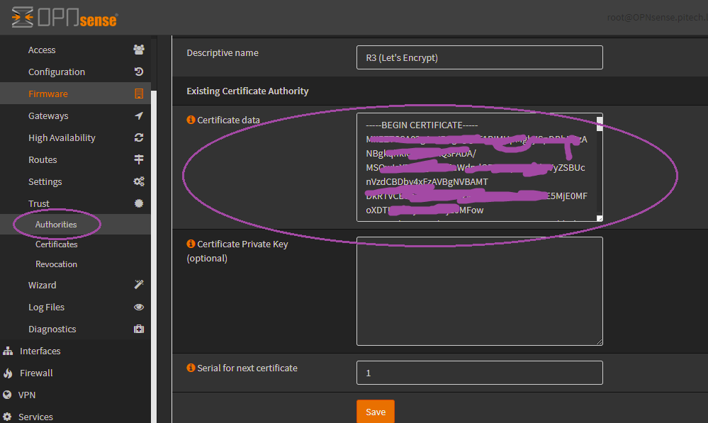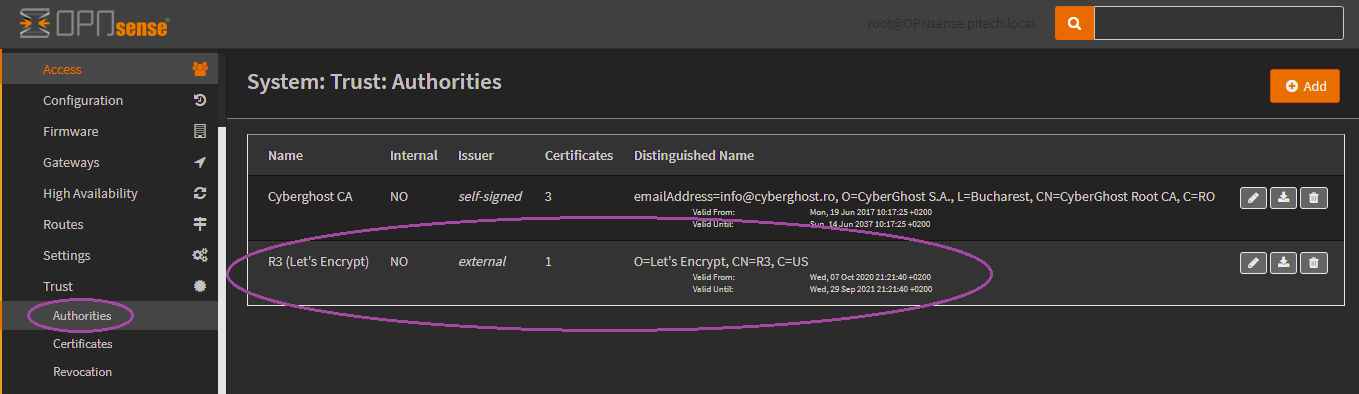 Als erster Schritt wird das Cyberghost-Zertifikat eingespielt, dazu einfach unter Trust/Authorities auf Add klicken und den Inhalt der ca.crt per Copy&Paste ins Feld Certificate data kopieren... fertig. Das ist nur einmal nötig, auch bei mehreren Tunneln, klar, die ca.crt ist immer das selbe Zertifikat, man sollte nur auf das Ablaufdatum achten, dann einfach eine neue bei Cyberghost runterladen und drüberspielen.