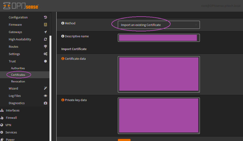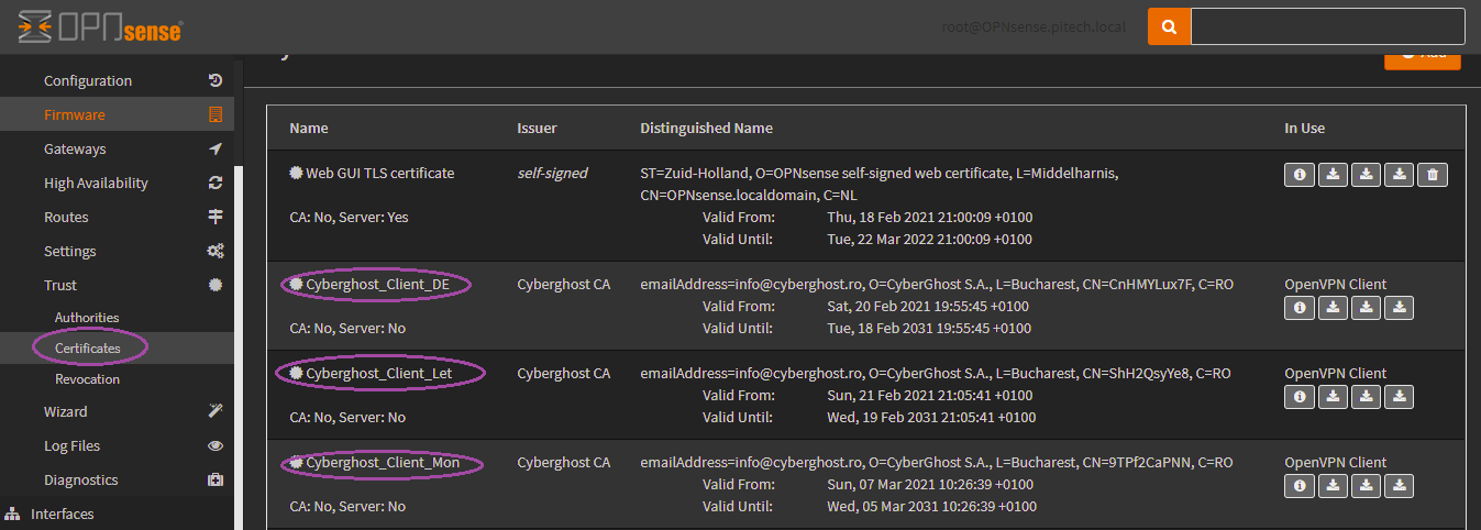 Nun folgt das Anlegen der Zertifikate für die Tunnel. In der Konfigurationsdatei von Cyberghost findet man eine client.crt und eine client.key. Unter Trust/Certificates legt man nun ein neues Zertifikat an und kopiert den Inhalt oben genannter Dateien in die entsprechenden Felder. Das kann man auch gleich mehrfach machen, falls man mehrere Tunnel anlegt. Im Screenshot hier habe ich beispielhaft mal 3 Zertifikate (Deutschland, Lettland, Monaco) angelegt.