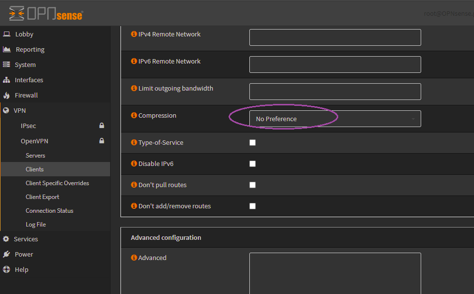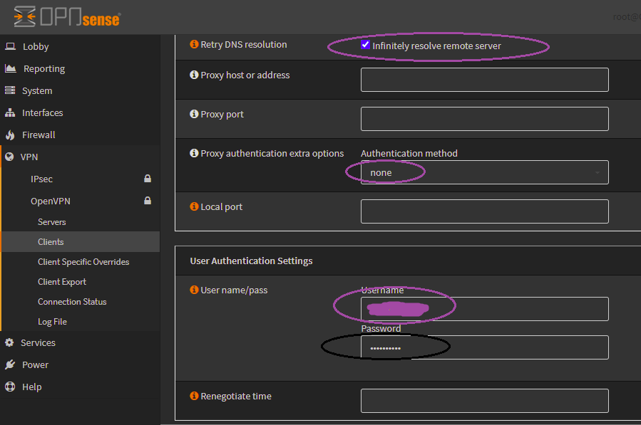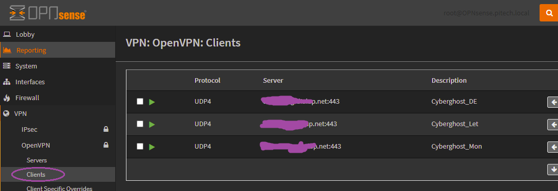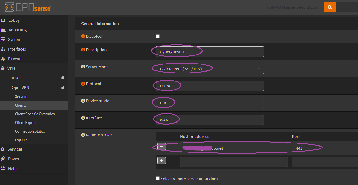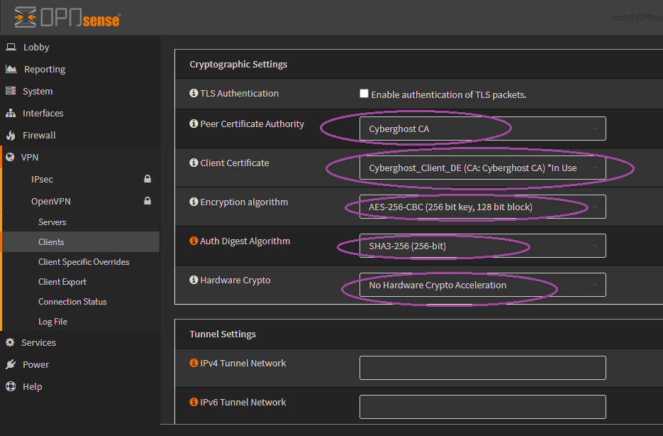 Nun folgt das Anlegen des Tunnels (oder der Tunnel). Dazu geht man zum Menüpunkt VPN/OpenVPN/Clients und legt hier einen neuen Tunnel an. Man übernimmt einfach die Werte aus der openvpn.ovpn-Datei von Cyberghost, bzw. die online im Cyberghost angezeigten Parameter. Im folgenden fünf Screenshots der etwas längeren Eingabemaske für den Tunnel, alles, was ausgefüllt werden muss, ist lila markiert.