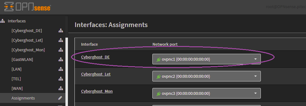 Um nun mit dem Tunnel arbeiten zu können, benötigen wir dessen (dynamisches) Gateway. Hierzu muss eine imaginäre Schnittstelle erzeugt werden. Wir gehen zum Menüpunkt Interfaces/Assignments. Als Name hab ich hier beispielhaft wieder Cyberghost_DE vergeben, für den deutschen Tunnel. Wie man hier sieht, werden die Netzwerk-Ports der Tunnel einfach durchnummeriert vergeben, hier eben ovpnc1. Wenn man auf einmal mehrere Tunnel anlegt, muss man sich halt im Schritt zuvor die Portnamen merken, oder man legt einen Tunnel komplett an, bevor man den nächsten erzeugt. Nach der Zuweisung sieht man sich die Eigenschaften von „Cyberghost_DE“ nochmal an. Das Interface muss aktiviert werden, bei IP wird nichts eingetragen. Durch Aktivieren dieser „imaginären“ Schnittstelle ohne IP passiert nun folgendes: Unter System/Gateways/Single erkennt man, dass automatisch das Gateway mit der gerade aktuellen (dynamischen) Gateway-IP angelegt wurde, hier sieht man auch schon mal, ob der Tunnel „steht“ (Das sieht man auch unter VPN/OpenVPN/Connection Status oder im Dashboard). Mit diesem Gateway können wir im nächsten Schritt arbeiten, um die Regeln für die Benutzung dieses Tunnels zu bestimmen.