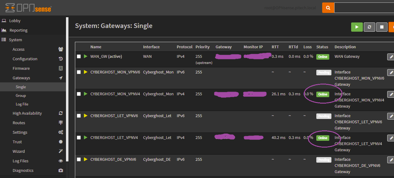 So, zum jetzigen Zeitpunkt funktioniert alles, außer einer Kleinigkeit, die wir nicht bedacht haben. Die opnSense reagiert wie viele Firewalls: Wenn ein Gateway nicht „Online“ ist, dann wird der ganze Verkehr ans Standardgateway (WAN) geleitet. Falls man also dieses Verhalten so möchte, ist hier Schluss: Wenn VPN down, dann surfen alle „ungeschützt“ weiter.