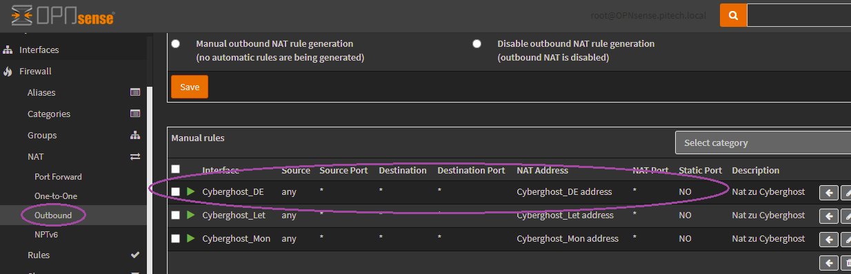 Für jeden Tunnel brauchen wir eine Regel, welche die Pakete auf die Gateway-Adresse des Tunnels umsetzt. Hierzu unter Firewall/NAT/Outbound eine Regel erzeugen.