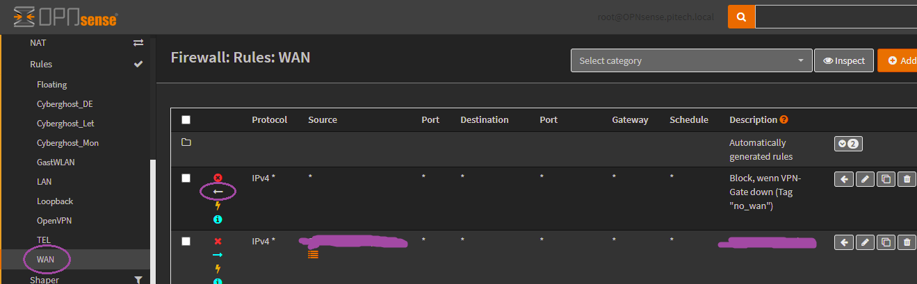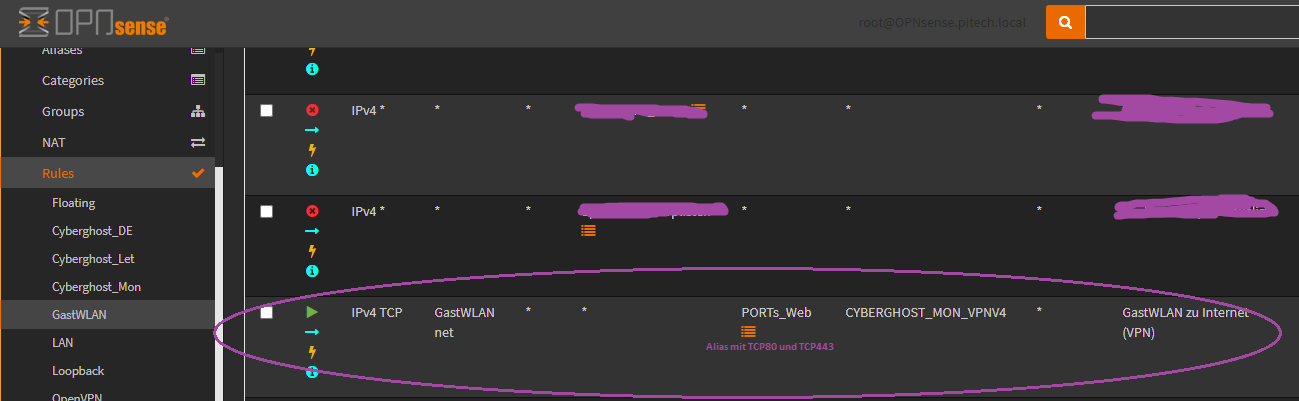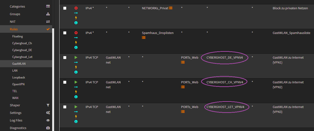 Ein Paket läuft in die Firewall rein und wird da verarbeitet bei den Regeln der Netzwerkkarte. Um bei meiner Beispielkonfiguration zu bleiben, kommen als erstes die Regeln GastWLAN IN. Da haben wir ja festgelegt, dass der Verkehr zum Tunnel gehen soll. Anschließend werden aber noch die Regeln WAN OUT abgearbeitet (Falls der Verkehr eben grad mal nicht durch den Tunnel gehen kann). ...und hier setzen wir an!