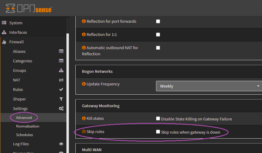 Wenn man jedoch möchte: Falls VPN down, dann kein Internet... Ist noch etwas nötig, um dieses Verhalten herbeizuführen. Die Quick&Dirty Lösung wäre, unter Firewall/Advanced den Haken zu setzen, Regeln zu ignorieren, deren Gateway down ist.