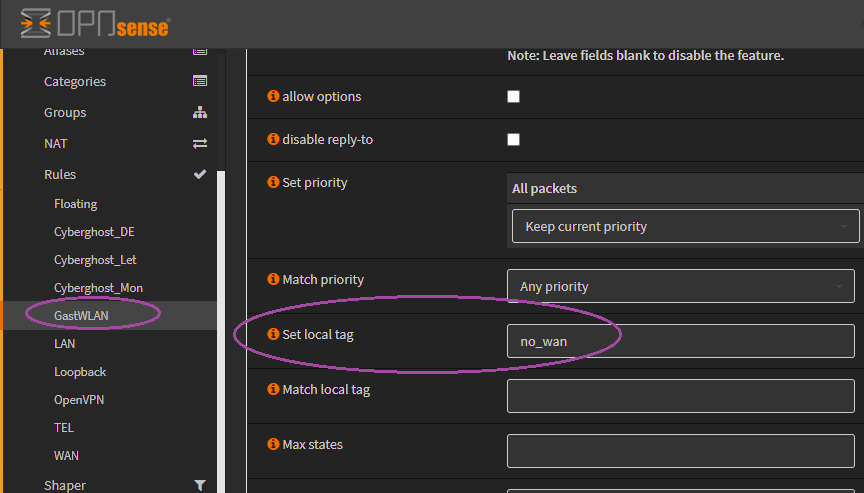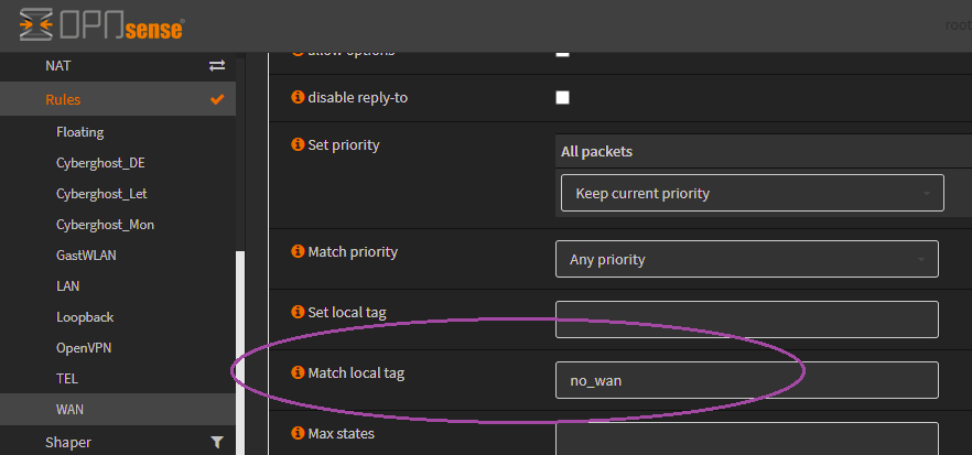 Diese Regel allein bewirkt jetzt gar nichts und kann einfach für immer so bleiben. Wir wissen nur: Wenn wir in irgendein Paket in das Tag-Feld „no_wan“ reinschreiben, wird dieses Paket niemals die Firewall Richtung WAN verlassen. Also können wir je nach Belieben die Tunnelregeln, bei der wir ans VPN-Gateway umleiten, um das „no_wan“-Tag erweitern, wenn gewünscht.